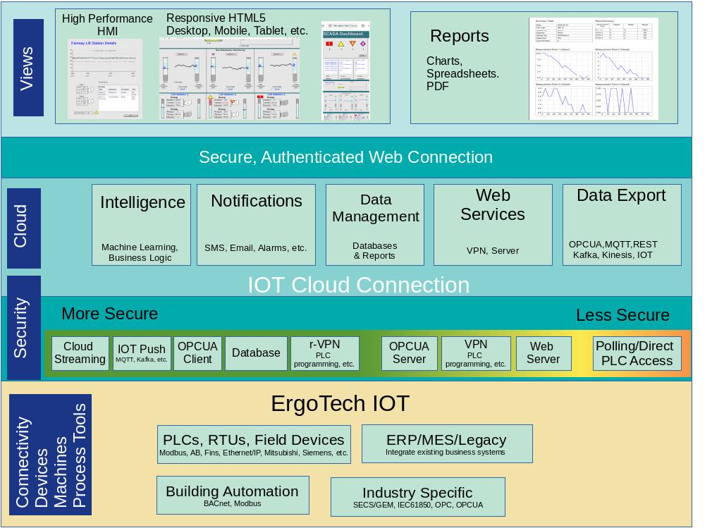 Manage data securely and seamlessly across your environment - Cloud, IOT, MES, ERP, GUIs, Databases, analytics, AI and back. Cloud-Native means more than easy-to-build dashboards and operator displays. Click-and-drag diagramming lets you build data flow so that you can manipulate streams of data everywhere in the Cloud. Take data from IOT and move them to a database, reporting, your AI and analytics applications and to views. Wrap-and-embrace legacy systems to integrate with MES, ERP and corporate manufacturing systems. Disassemble different streams and recombine them to seamlessly move massive datasets around within the Cloud in real time. Decisions made in the Cloud, by smart analytics or user interactions are easily streamed back to your IOT devices and facilities or manufacturing systems. Native HTML5 graphics mean responsive web-based displays.